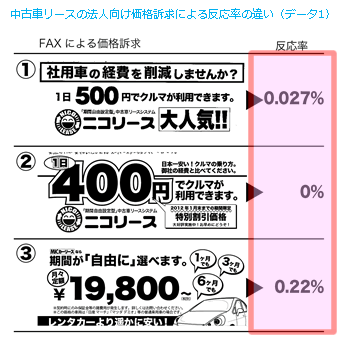 この時の経験を思い出しました。消費者心理には、「適正料金」というものが存在するのでしょうね。中古車リースを「ほっとけ販売」するためにホームページで告知していますが、法人向けにはファクスでもご案内していま す。近隣の約7,300社に対し、FAX送信しているのですが、やはり価格訴求の方法により反応はまったく異なります。