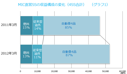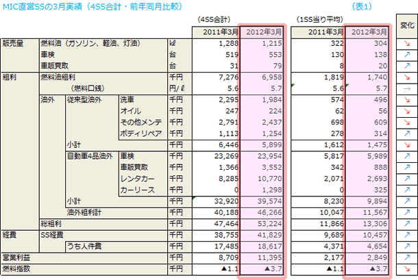 (1)昨年3月は震災後のガソリン供給不足に見舞われましたが、今年3月の販売量はさらに悪化し、4SS合計で前年同月比70kl減販しました。燃料油口銭も変化はありません。