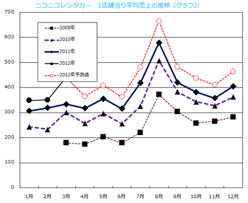 レンタカーが当社4SSで1000万円のビジネスになっています。レンタカーも季節需要があり、8月がピークを迎えますが、多くの人々が新生活を迎える3月も需要が多くなります。 (グラフ2)は、ニコニコレンタカーの加盟店の平均売り上げを示したものです。 当社SSだけでなく、どの加盟店でも年々着実に平均売り上げが上昇しているのが分かります。今年8月は平均65万円、3年前の1.8倍となる見通しです。