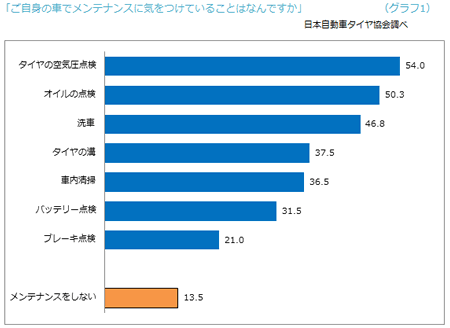 次に、VIP予備軍である「カーケアクラブ」会員に対して定期的なフォローを実施します。 DMを発信したり、店頭でウィンドウオッシャー液などを補充したり、タイヤの空気圧点検などのサービスをします。ドライバーが最も気にしている愛車のメンテナンスはタイヤの空気圧です(グラフ1)。