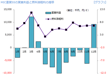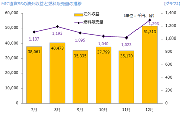 グラフ1は、昨年1年間の燃料油粗利と営業利益の推移です。当社SSは燃料油に対する依存度が低くなっているとは言え、やはり燃料粗利か低い月は赤字に陥ります。