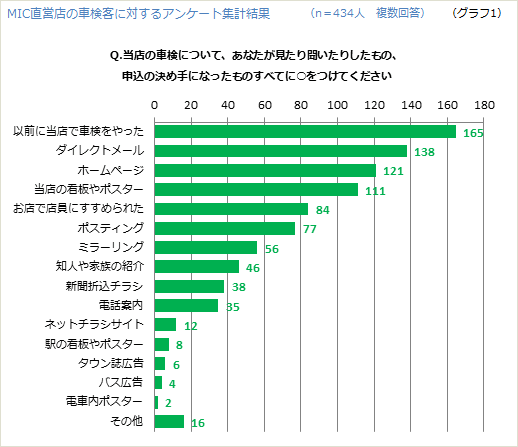 そこで車検客に対し、こんなアンケートをお願いしました。 「当店の車検について、あなたが見たり聞いたりしたもの、申し込みの決め手になったものすべてに○をつけてください」というものです。その集計結果が(グラフ1)です。