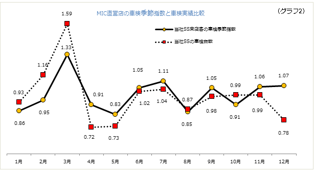 そこで車番認識システムを活用し、当社SSに来店する車両のナンバープレートのデータをもとに国土交通省から車検データを入手し、より現実的な季節指数を算出してみました。これを、SSの車検実施台数の月間平均値を1とした場合を重ね合わせてみたのが(グラフ2)です。