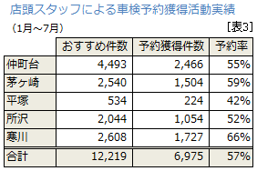1~7月の7カ月間に、SS利用客1万2,219人に車検をすすめ、6,975件の予約を獲得しました。お客様に聞くと「店頭ですすめられた」と思っている方は2割くらいしかいませんでしたが、実際は店頭予約が圧倒的に多いのです。