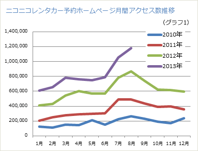 ところが、市場規模はそれ以上に拡大しています。ニコニコレンタカーの予約ホームページのアクセス数は、ついに月間100万件を超えました(グラフ1)。