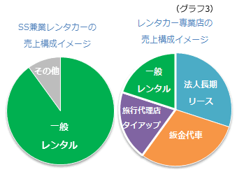 これをカバーするには、「一般貸し」だけでは足りません。法人需要や鈑金代車、旅行代理店の紹介などを取り込む必要があり、既存レンタカー業界の牙城を崩さなければなりません(グラフ3)。