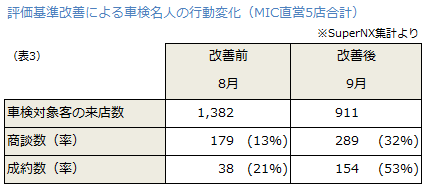 「表3」は評価基準の改善前 (8月)と改善後(9月)の車検名人の行動変化です。