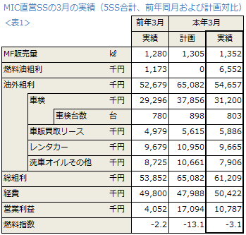 車検は800台を実施し、3,100万円の収益を得、油外全体の約6割を占めます。燃料指数はマイナス3でしたが、5円/L弱の燃料油マージンを確保できたので、営業利益は1,000万円を超えました。