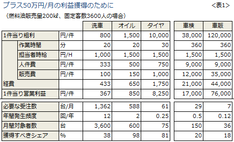 同様に、オイル交換で50万円を新たに稼ぐためには、SS利用客の98%のシェアを獲得、タイヤなら80%のシェアを獲得しなければなりません。なおさら不可能です。