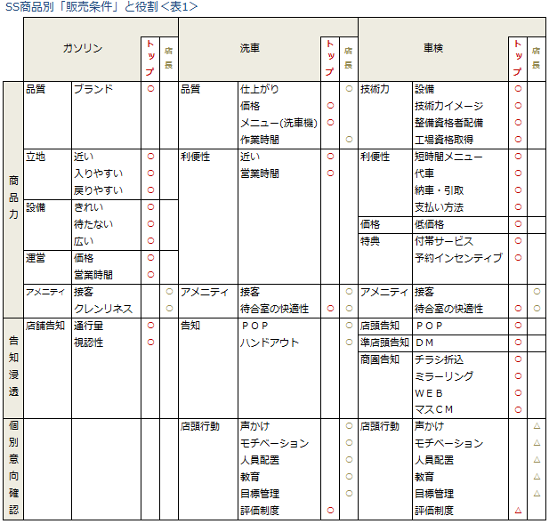 表1は、SSが取り扱う商品別に販売要因を分析し、また、その販売要因を作るのは誰の仕事かを整理したものです。