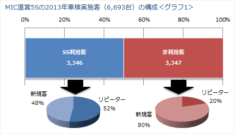 2013年に当社のSSで車検を実施していただいた6,700台のお客様が、普段から当社SSをご利用いただいているお客様かどうかを分析したのが(グラフ1)です。