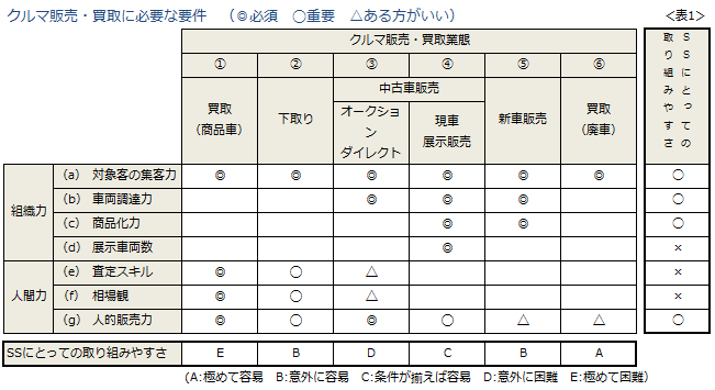 〈表1〉は、これまでの経験から、およそ車の売買ビジネスに必要な要件を整理したものです。 クルマ売買の業態を、①~⑥の6つに分類し、それぞれに必要な要件を、◎○△で示しました。◎は必須要件です。