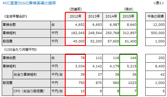 この趨勢をもとに、車検販売改善活動を始める前の2012年から今年までの車検実績の推移をまとめたのが〈表1〉です。