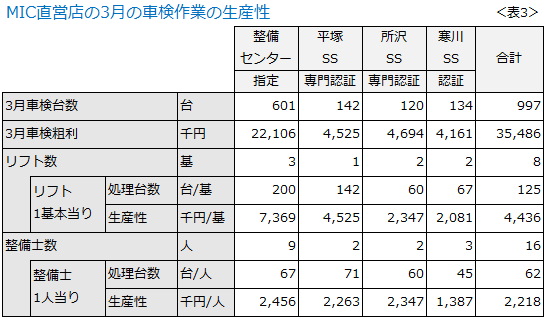 作業キャパシティは、「設備」(リフト)と「人」(整備士)の両面でとらえなければなりませんが、3月の車検に対して、作業効率を分析したのが〈表3〉です。