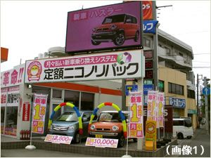 折り込み広告はもとより、店頭看板(LED看板など)で毎日商圏に告知し、その存在感を浸透させています。そして、カーディーラーから「旬」の新車を借りて店頭に展示しています(画像1)。