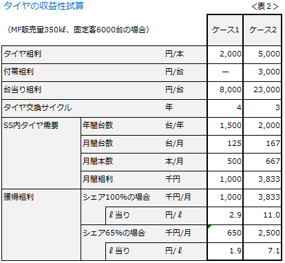 つまり、工賃込みで1本当たり2000円くらいしか粗利を稼げない。例えSS利用客の需要を100%獲得したとしてもL当たり3円にも満たないじゃないか・・・。そう思って敬遠していました(〈表2〉のケース1)。