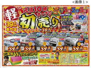 これを初売り特価でアピールします。 目玉は平成27年式、走行3千キロのアルトの最新モデル。新品タイヤ4本をつけ、破格の39万8千円。「持ってけドロボー!」セールと意気込みました。