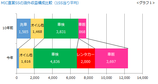 10年かけて油外収益が500万円増え、気がつけば、油外収益だけで総経費をまかなえるSSになりました。その立役者は「車検」「レンタカー」「車販」です。それぞれ10年間で100万円、200万円、300万円増収しました(グラフ1) 。