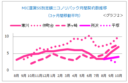 グラフ2は、その契約実績の推移です。傾向を見るため、3カ月間の移動平均値を示しています。どのSSでも、発売時はスタッフ育成も兼ねてイベントを実施しますので盛り上がります。