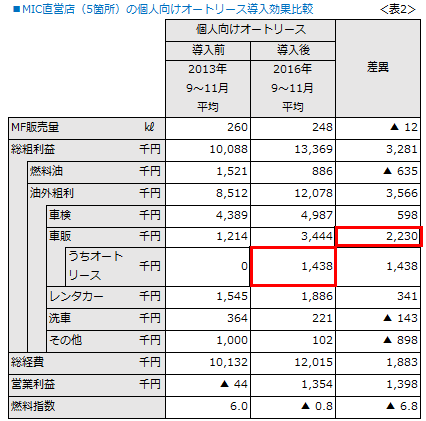 表2は、当社が個人向けオートリースに取り組む前と現在との比較です。 何と言っても車販が200万円以上伸びたのが際立ちます。油外収益で総経費をカバーできるようになり、燃料指数もマイナスにしてくれた立役者ですが、まだまだ伸びシロがあると手応えを感じています。