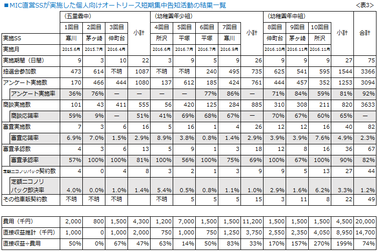 この方式を、今年は各SSともに年4回継続しようと考えていますが、気になるのはやはり「費用対効果」です。折り込み広告や店頭POP、人件費、景品など費用も随分かかっています。最初は200万円くらいかけても思うほど成約しないので、5回目には思い切って700万円投入してみました。